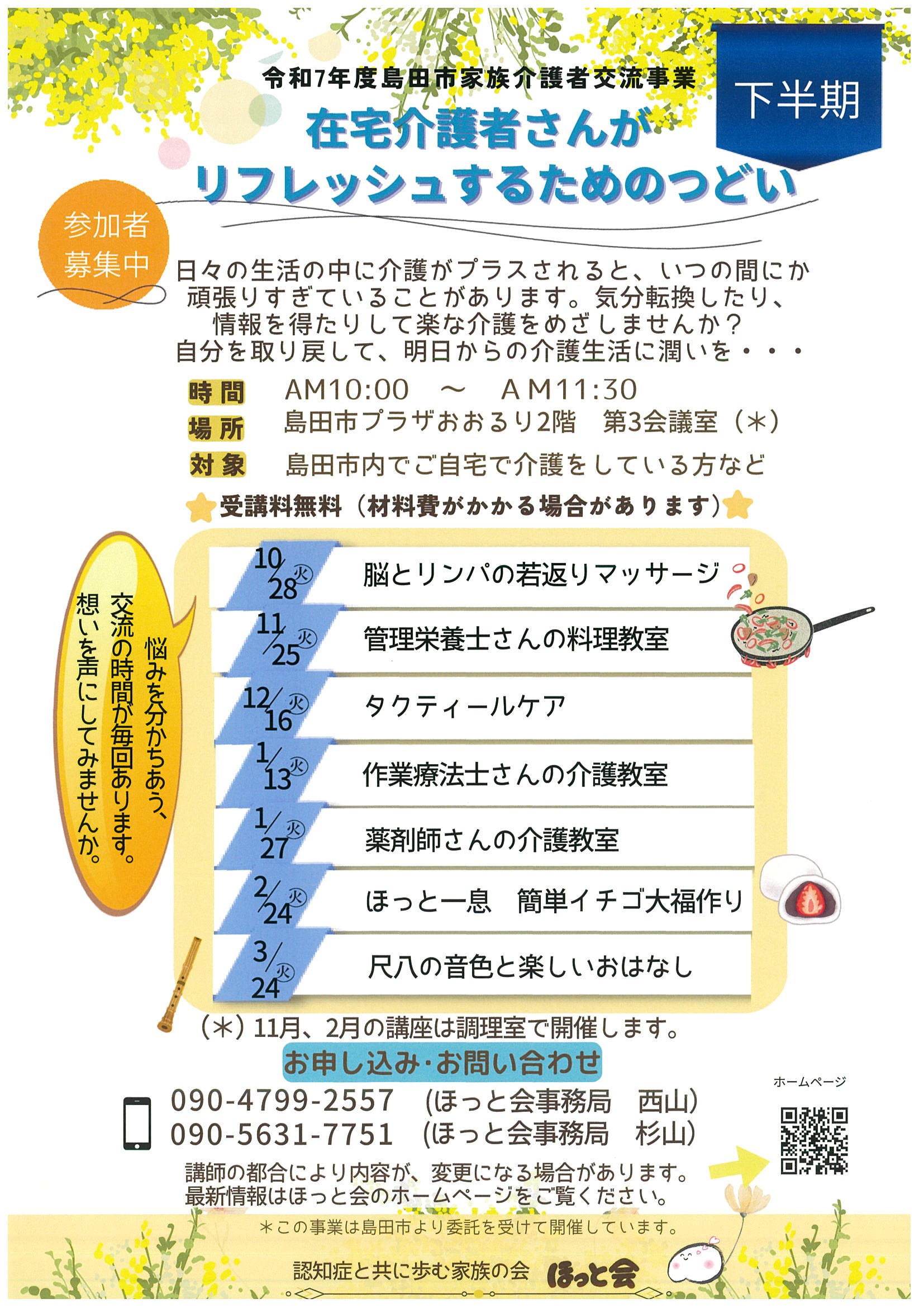 令和7年度島田市家族介護者交流事業「在宅介護者さんがリフレッシュする為のつどい」【下半期】