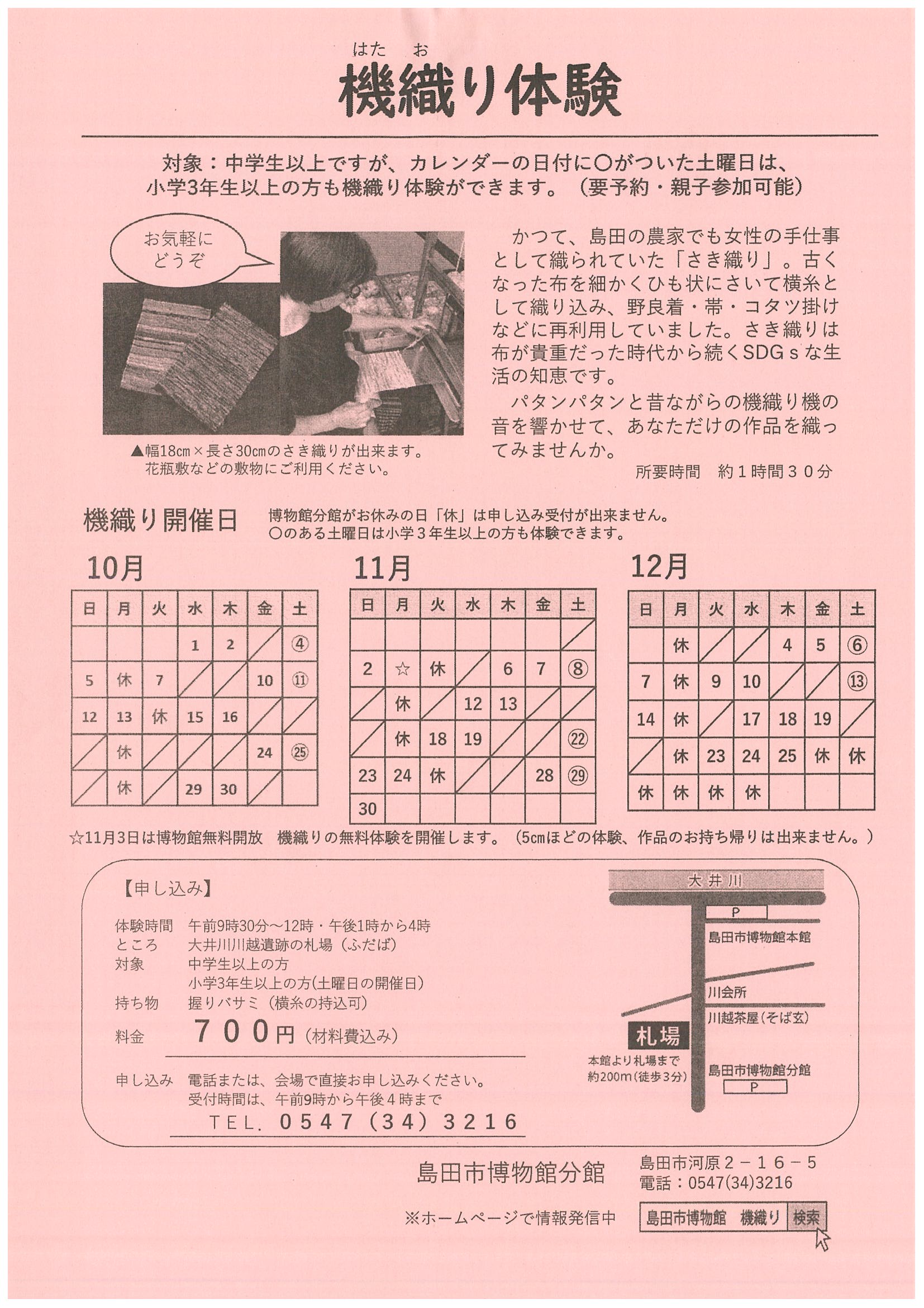 島田市博物館分館『2025年10~12月 機織り体験』