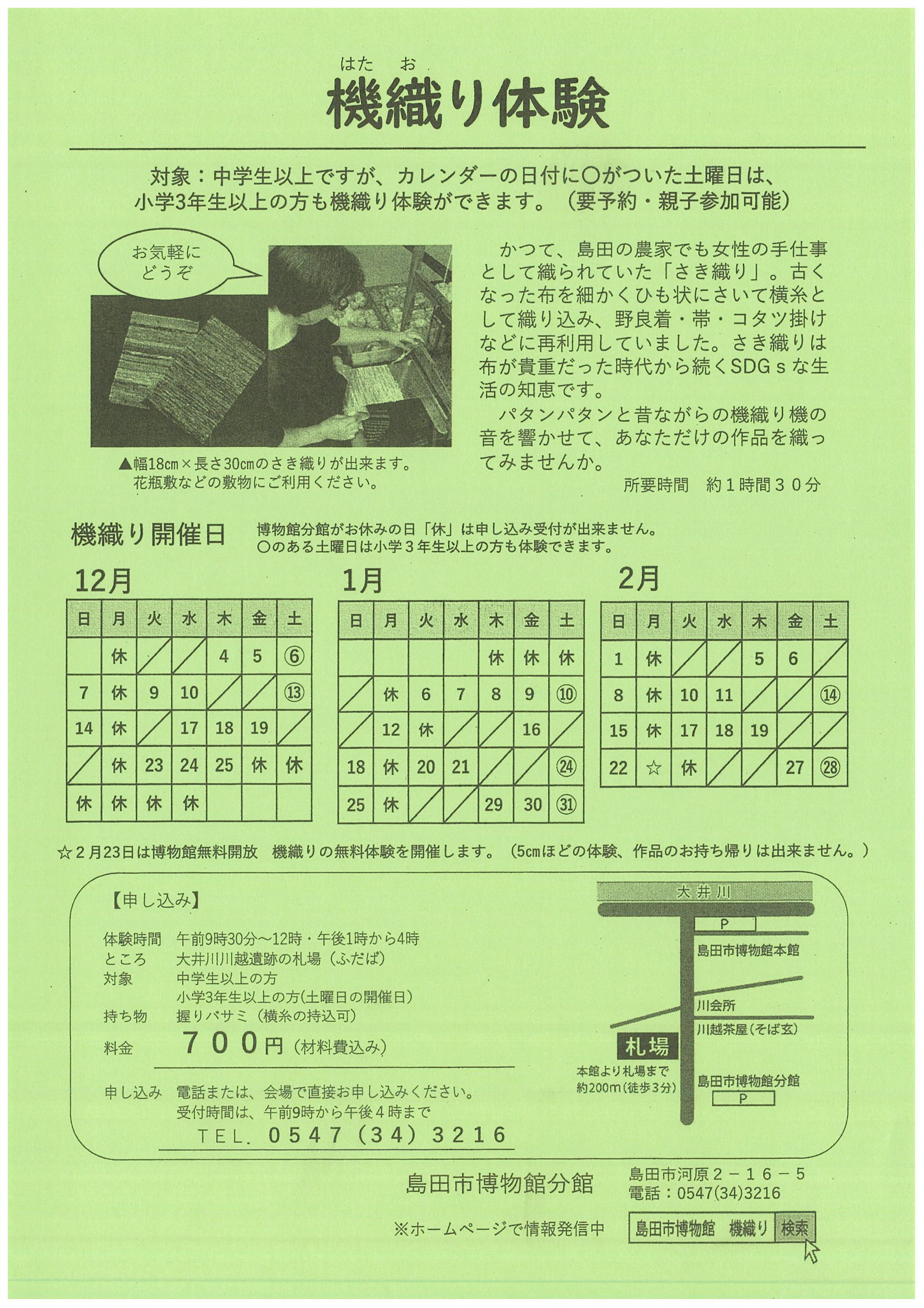 島田市博物館分館 2025年12月~2026年2月 機織り体験日