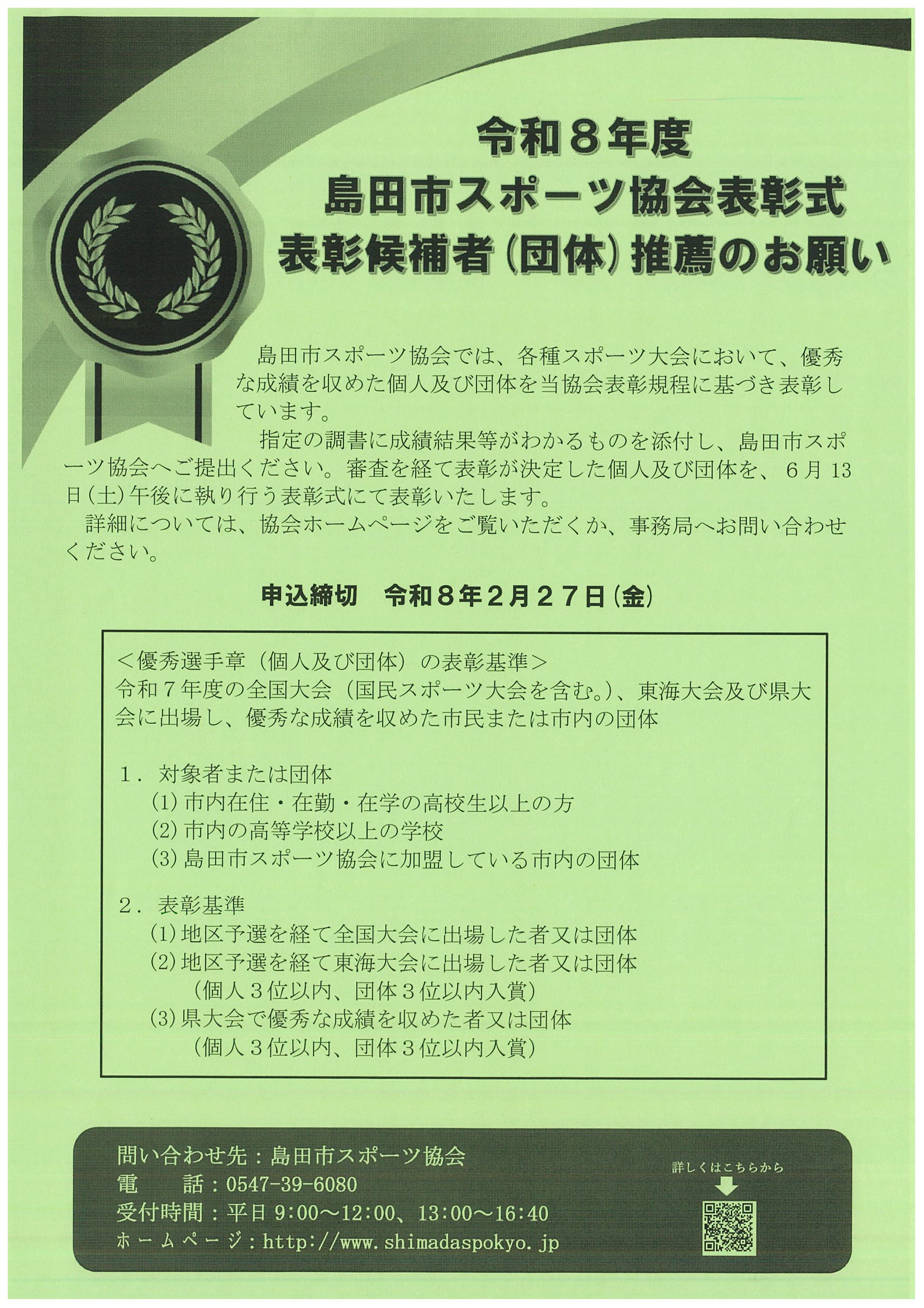 島田市スポーツ協会表彰式「表彰候補者推薦のお願い」